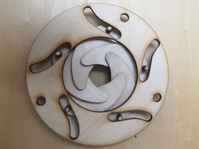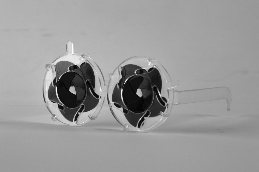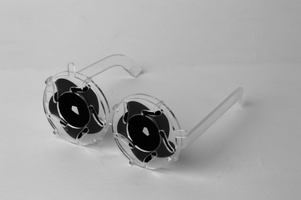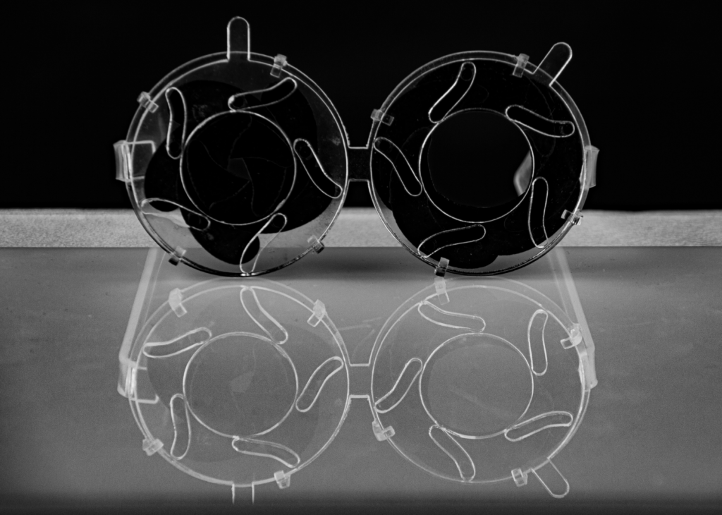 This interplay of light coming in and changing of focus was a fascinating element to me. I took the mechanics of it and turned it into a sketch, laser cut it out wood and later on out of plastics. I wanted to create something like glasses which could regulate how much light can come in our eyes, or, how much information is allowed to access our minds. Or it could be about what we choose to see / ignore. I’ll leave that open for interpretation.